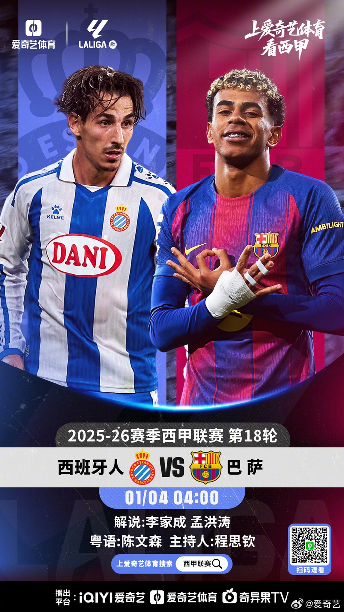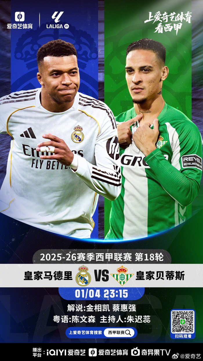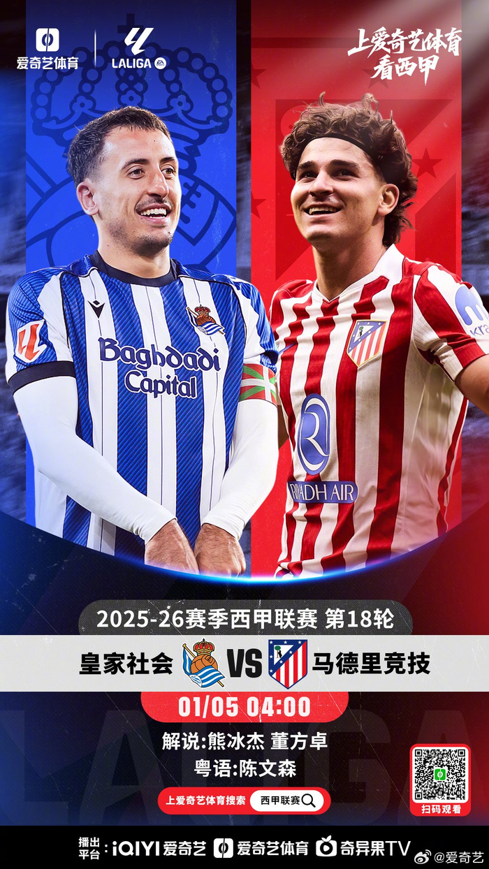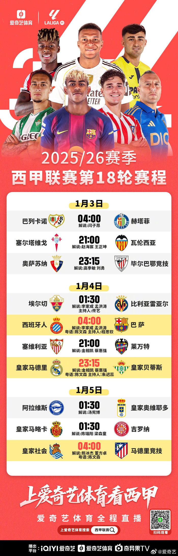 #上爱奇艺体育看西甲# 2026年,西甲正式回归。联赛第18轮,巴萨客战西班牙人,上演加泰德比。皇马战贝蒂斯,姆巴佩安东尼天才对决。马竞远征皇家社会,床单军团能否延续强劲势头。激情西甲,尽在爱奇艺体育。#上爱奇艺体育看顶级赛事# #西甲联赛#