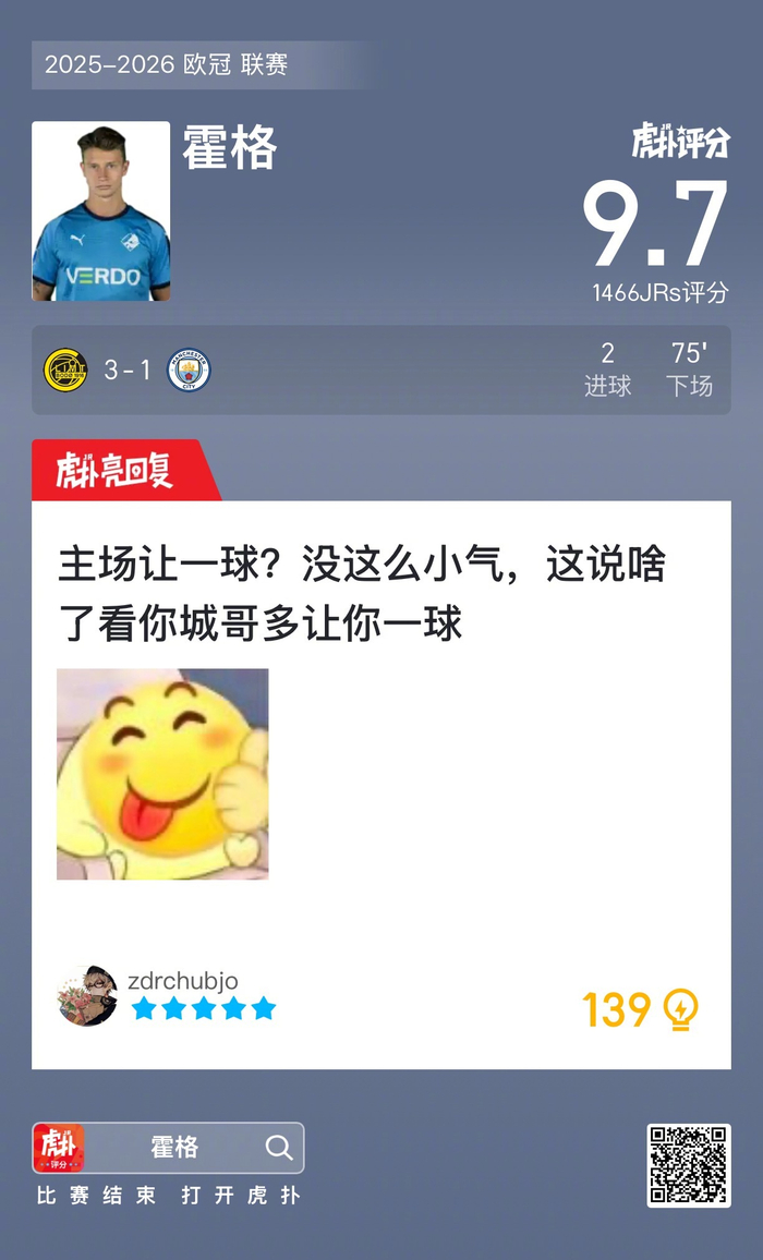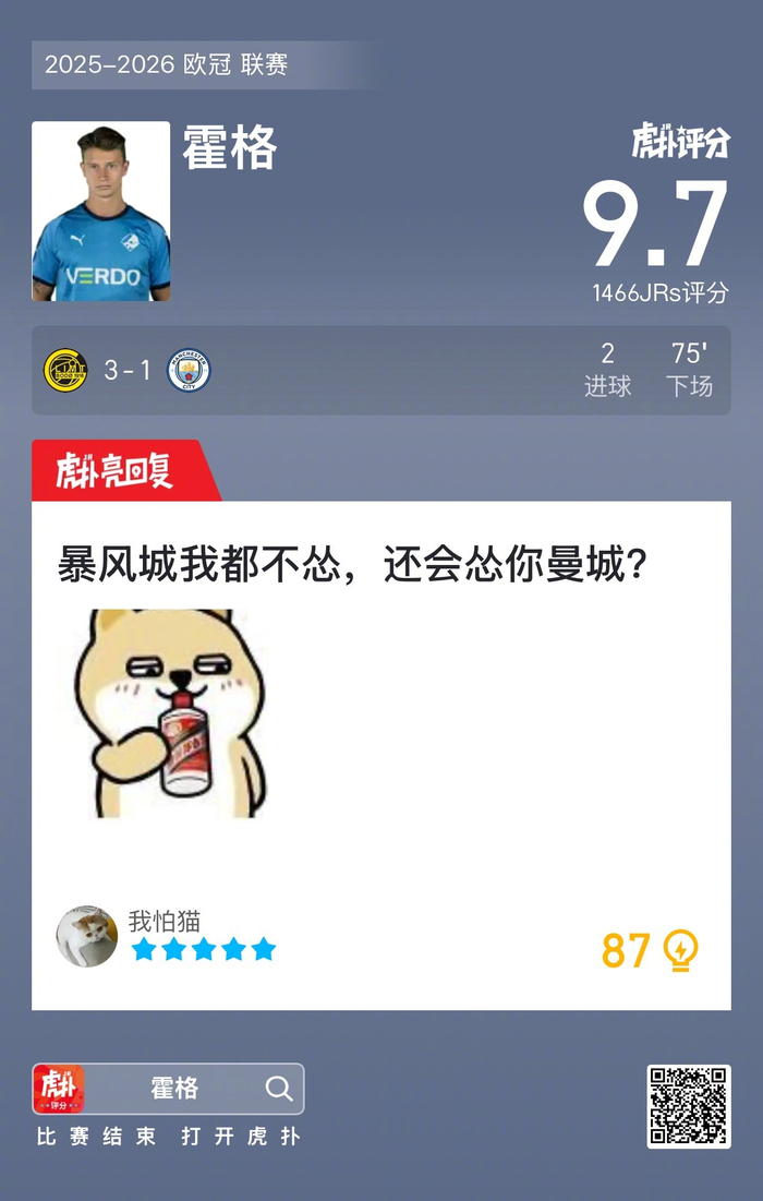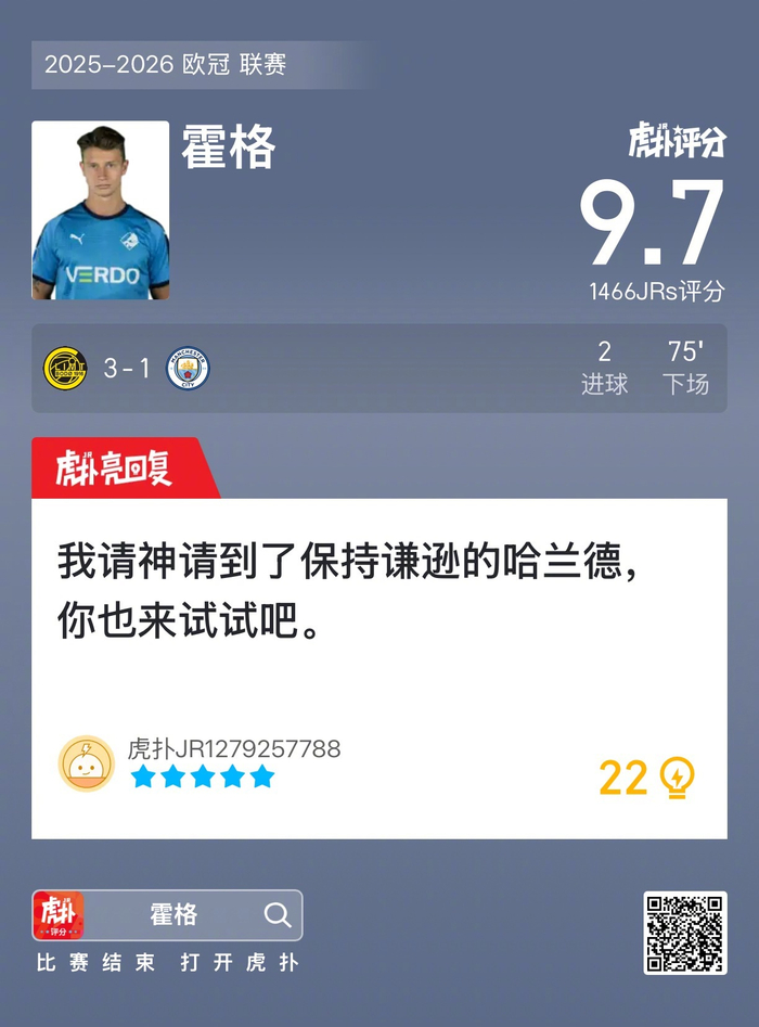 #博德闪耀3比1曼城# 霍格打进两球,赛后收获9.7的虎扑评分!