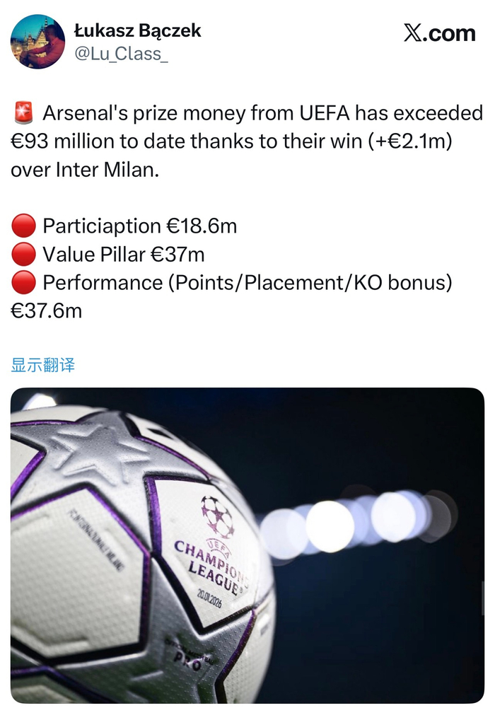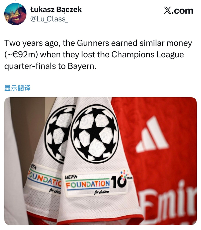 在击败国际米兰后,阿森纳本赛季欧冠累计奖金已经突破9300万欧,这比两年前欧冠八强输给拜仁慕尼黑后拿到的约9200万欧还要多。竞争力带来节节攀升的收入🤑