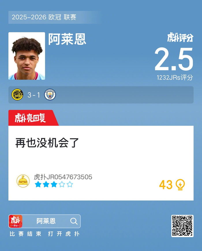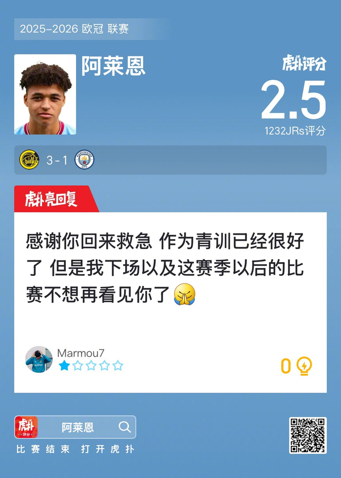 #博德闪耀3比1曼城#阿莱恩本场表现不佳,仅收获2.5的虎扑评分!