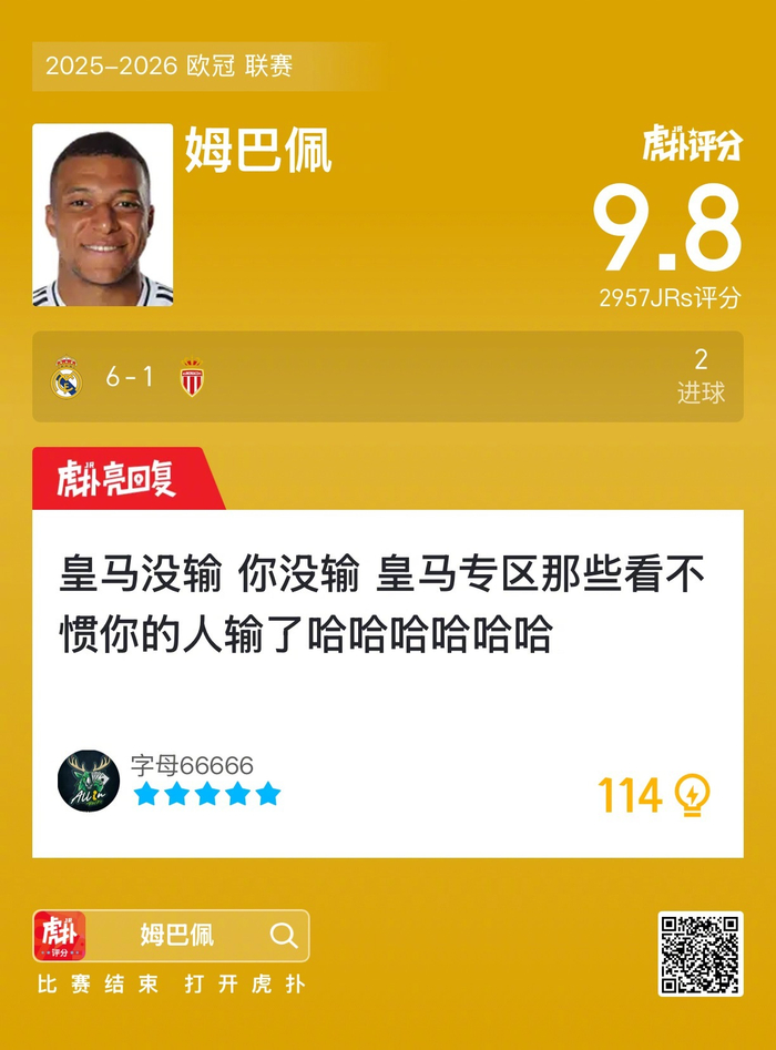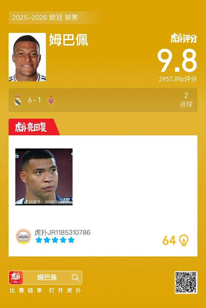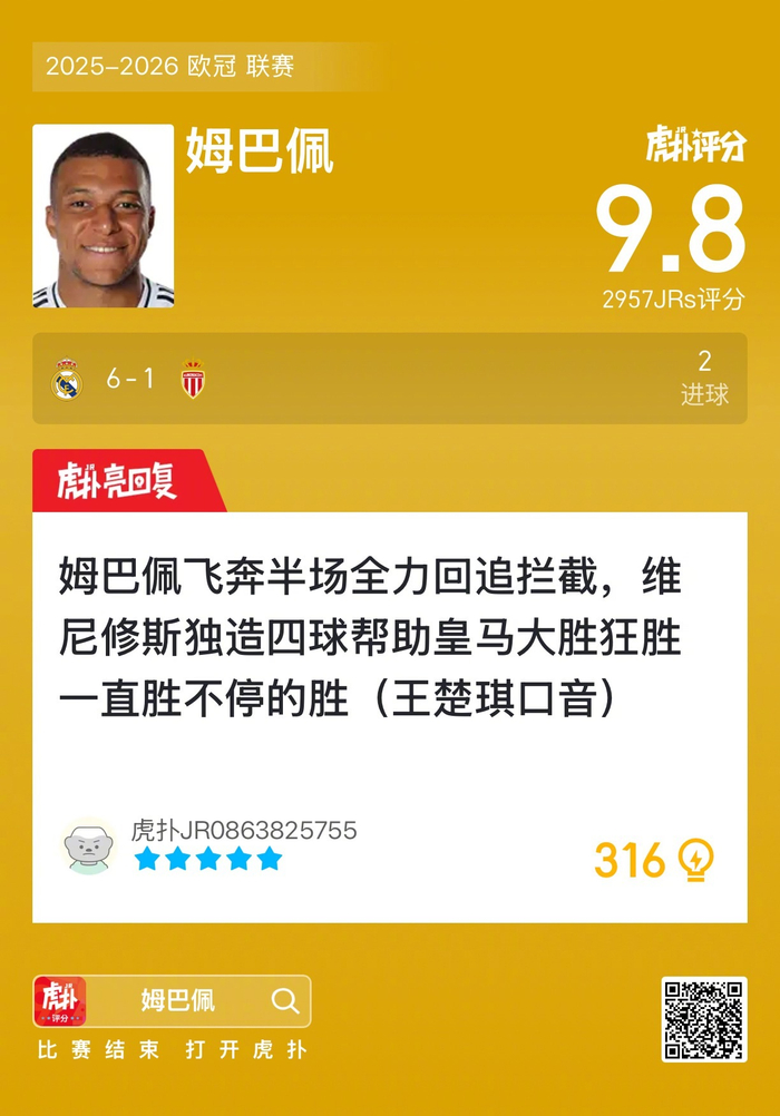 #皇马6比1摩纳哥# 姆巴佩打进两球,赛后收获9.8的虎扑评分!