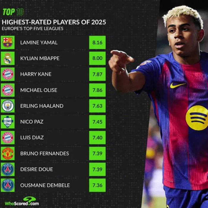 Whoscored官方公布2025球员评分前十名排行榜,亚马尔以8.16分居首,姆巴佩和凯恩分列二、三位。