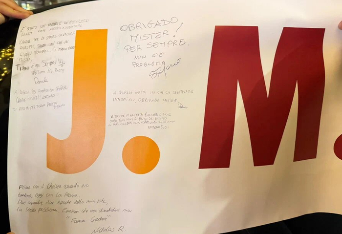 最后球迷们送给了穆帅一条写满了致辞的横幅,他情绪有点激动,向大家表达了谢意。