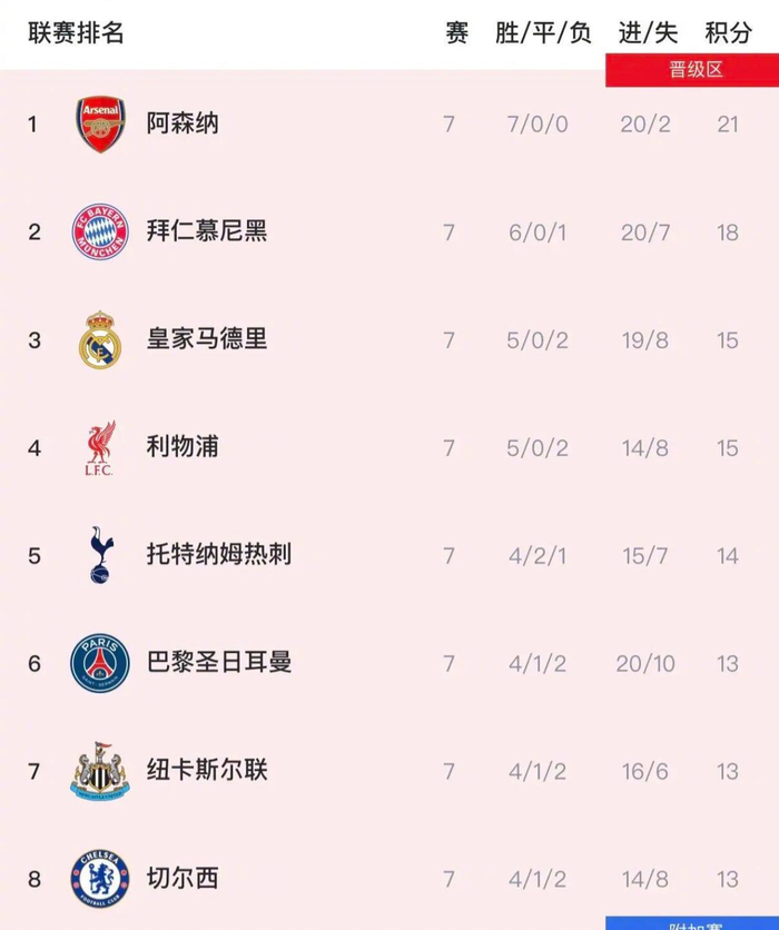 第七轮战罢,欧冠晋级形势:阿森纳与拜仁提前锁定直通名额,13分集团的8支豪门(巴黎、纽卡、切尔西、巴萨、葡萄牙体育、曼城、马竞、亚特兰大)将在末轮展开生死对决,争夺剩余6个直接晋级名额;附加赛席位争夺同样激烈,多特蒙德、加拉塔萨雷等队需在最后一轮全力抢分。