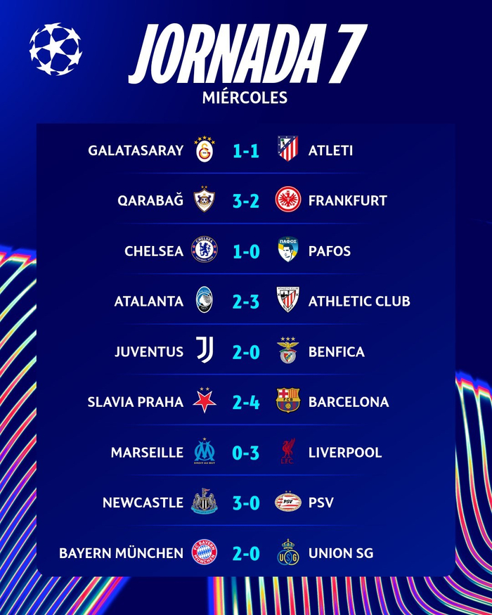 【欧冠赛果】 今天凌晨结束的#欧冠联赛# 第7️⃣轮第②比赛日赛果。