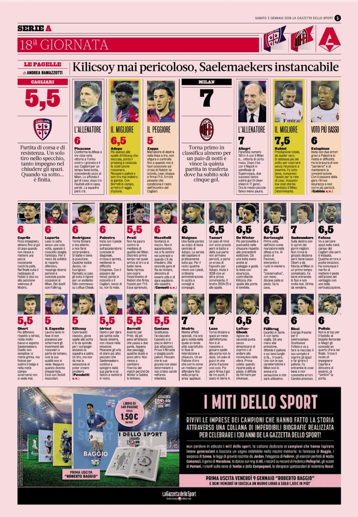 【米体】 #卡利亚里0比1AC米兰# 赛后评分:
