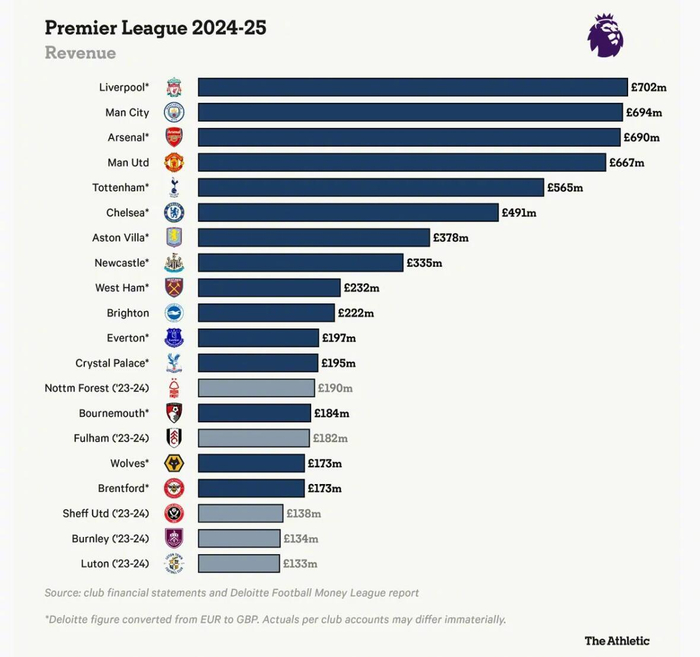 利物浦成为英超第二家收入突破7亿英镑的俱乐部,曼联在英超时代首次跌出收入榜前三名,阿斯顿维拉凭借欧冠赛事增收1.02亿英镑(增幅37%),排名第七。