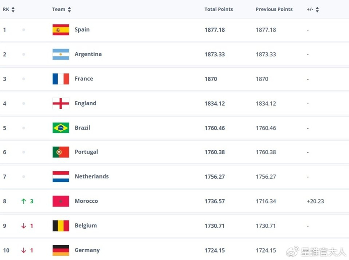 国际足联更新排名,西班牙仍排名世界第一,阿根廷第二,摩洛哥非洲杯夺得亚军,上升3名排在第8,塞内加尔非洲杯夺冠,排名升至第12,上升7名。