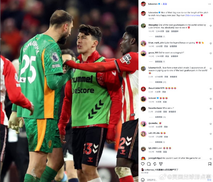 桑德兰球员卢克·奥尼恩在IG发文:“对方那位大个子特地从球场这一头跑到另一头来祝我新年快乐,真是太有风度了。好兄弟 @ 多纳鲁马❤️”#桑德兰0比0曼城#赛后,多纳鲁马与桑德兰球员发生小摩擦,最后被扎卡和瓜迪奥拉拦住。
