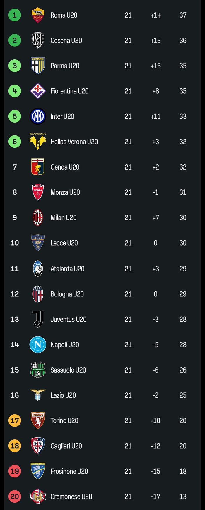 【预备队积分榜】2025-26赛季#意甲# 预备队联赛第21轮积分榜: