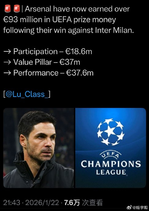 所以这也是欧洲俱乐部重视欧冠的原因,反观亚足联苦心经营了这么多年的亚冠,参赛俱乐部通过亚冠所能得到的回报,和欧冠相比仍然不值一提。根据外媒统计(图一),英超阿森纳在欧冠客场战胜国米后,本赛季通过欧冠获得的奖金已经超过9300万欧元。其中包括参赛奖金:1860万欧元。根据收视和各种系数分配的部分:3700万欧元。球队因为每场胜负以及成绩拿到的部分:3760万欧元目前阿森纳本赛季欧冠总奖金为9320万欧元。这还没有包括他们每个欧冠主场球票等等比赛日收入。下面这段视频是阿森纳本赛季欧冠主场对拜仁慕尼黑的比赛,从场外到场内的大场面。