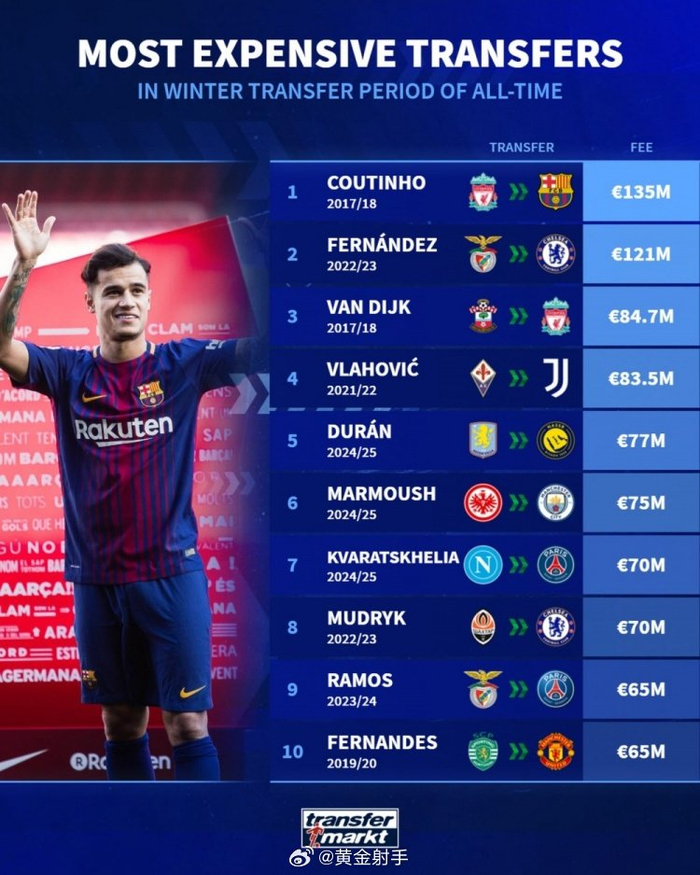 #曼城[超话]# 德国转会市场列出冬窗最贵转会排名,库蒂尼奥1.35亿欧居首。