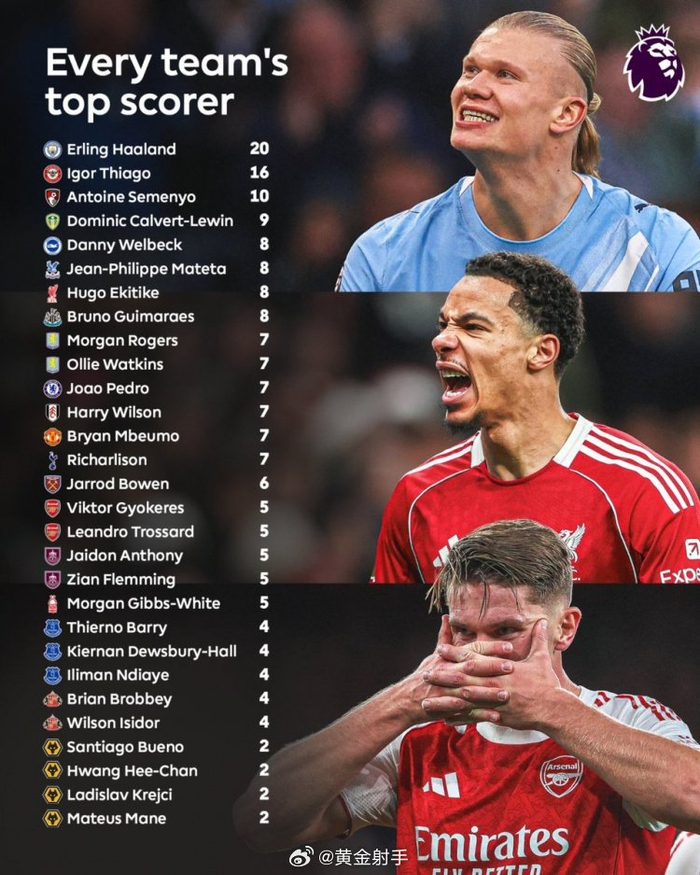 #曼城[超话]# 英超官方列本赛季各队联赛射手王,曼城哈兰德、切尔西若昂·佩德罗、曼联姆伯莫、阿森纳约克雷斯+特罗萨德、利物浦埃基蒂克、热刺里沙利松。