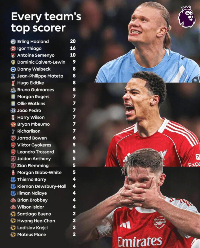 英超官方盘点了本赛季英超各球队的联赛射手王,详情如下↓