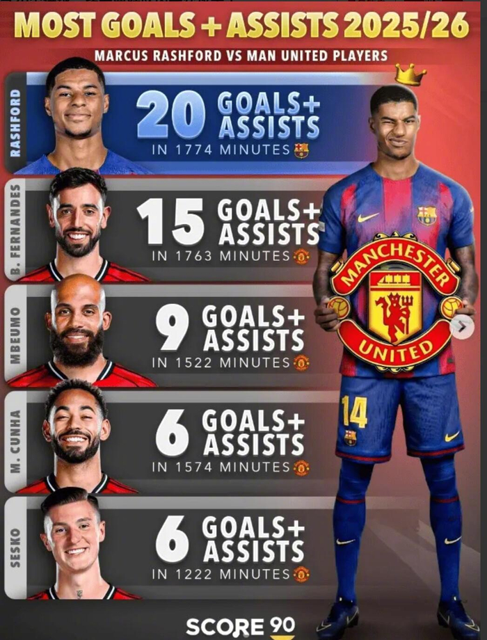 根据Score 90的统计,拉什福德本赛季已经在各项赛事直接参与了20个进球,这项数据多于曼联队内的一众攻击手。