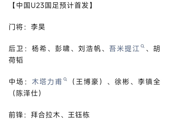 除了U23国足将明着打以外,咱们的首发11人名单也基本出炉。据报道,目前在U23国足的队中,只有鲍世蒙1人身体还没恢复到最佳状态,其他球员均可以在决赛出场比赛。按照之前比赛的实际情况来看,这一次安东尼奥应该还会排出532的阵型,而首发球员也不会有太大的变化。门将肯定还是由李昊首发。此前李昊打满了5场比赛,出场了480分钟,贡献了28次扑救,并且保持0丢球,因此他肯定还会首发。