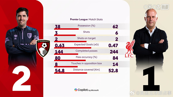 半场结束,伯恩茅斯暂2-1领先利物浦