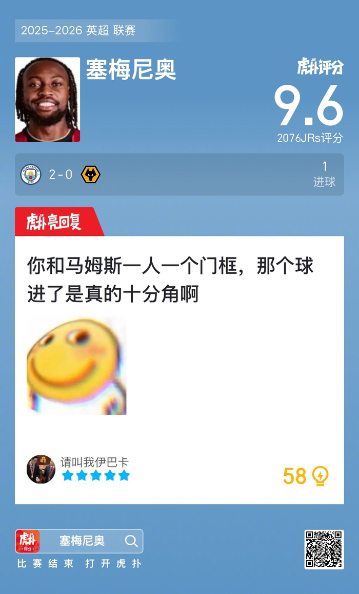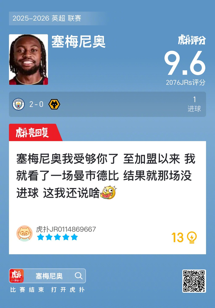 #曼城2比0狼队#塞梅尼奥打进一球,赛后收获9.6的虎扑评分!
