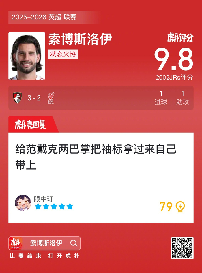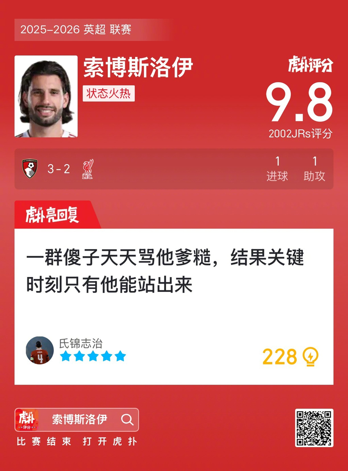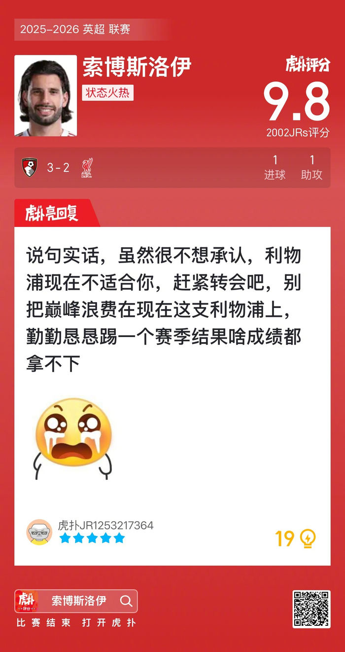 #伯恩茅斯3比2利物浦#索博斯洛伊贡献一球一助,这表现你们给几分?