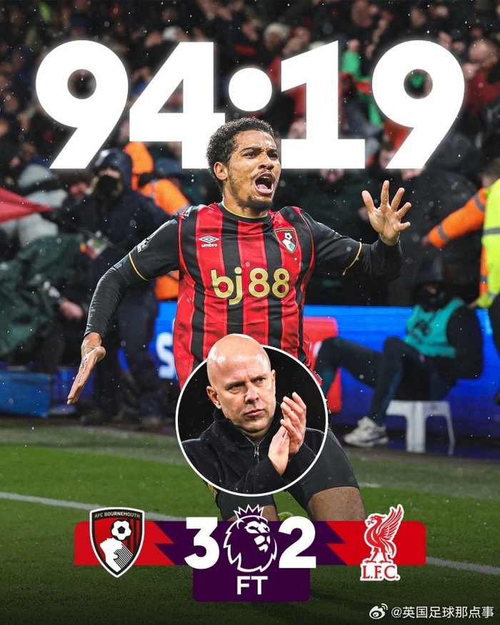 伯恩茅斯3-2利物浦(阿德利第90+5分钟绝杀)