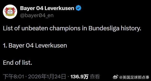 作为德甲历史上唯一一支不败夺冠的球队,勒沃库森官媒在拜仁比赛结束后写道: