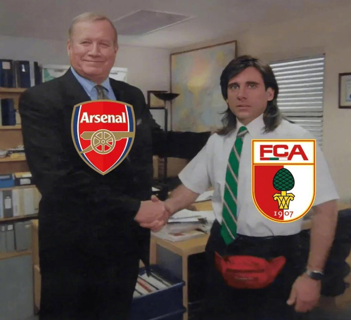 奥格斯堡首先发布的梗图为:“赛季至今仅两支球队击败拜仁 🤝 @阿森纳”