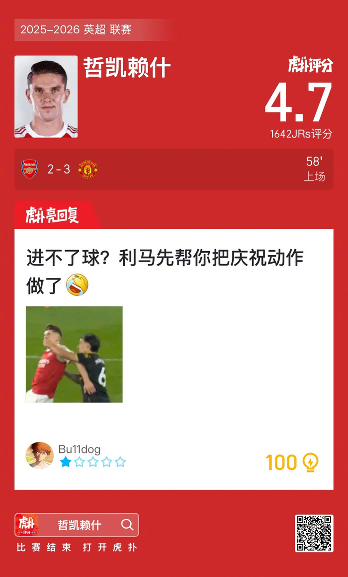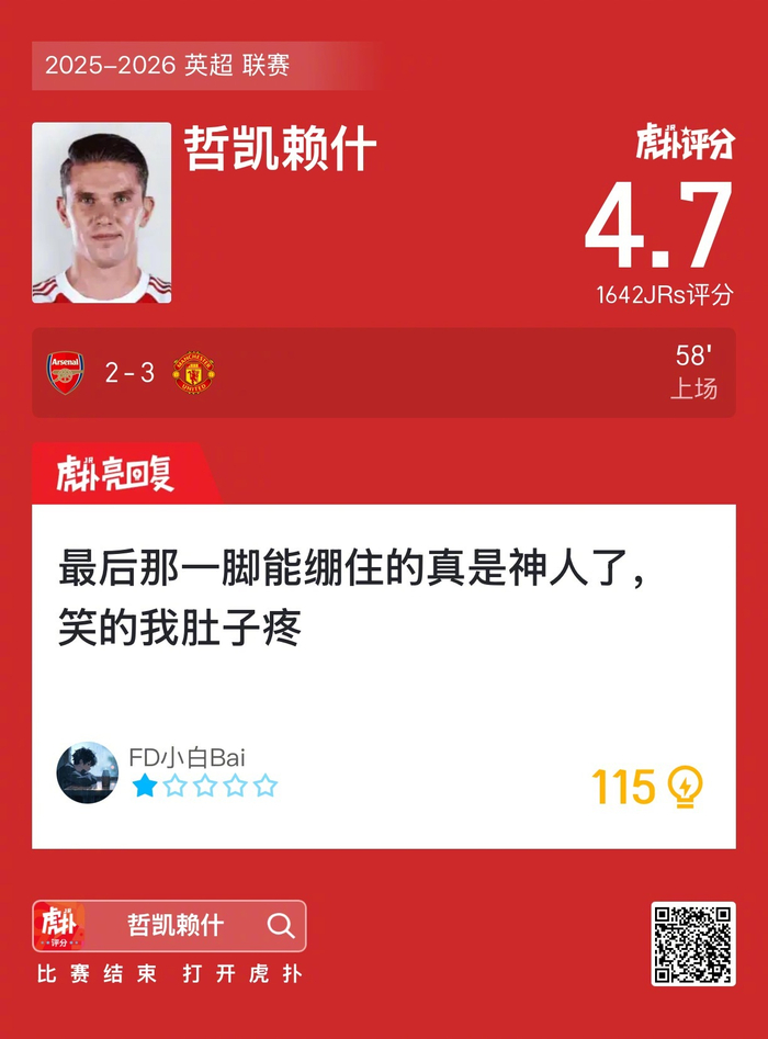 #阿森纳2比3曼联# 哲凯赖什赛后收获4.7的虎扑评分!