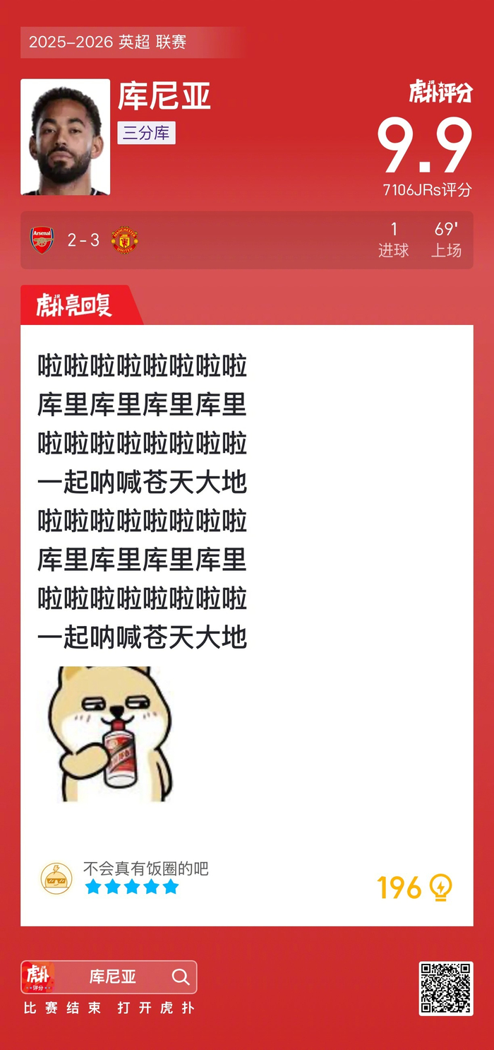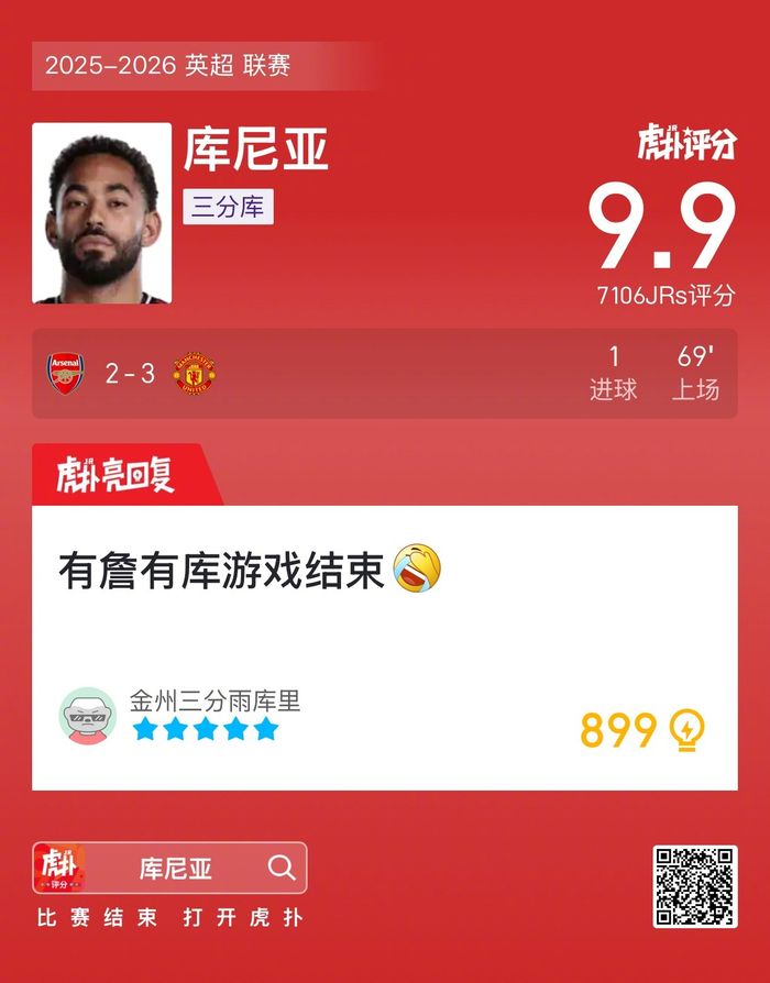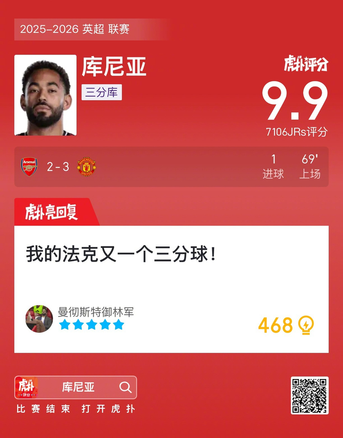 #阿森纳2比3曼联# 库尼亚打进一球,赛后收获9.9的虎扑评分!