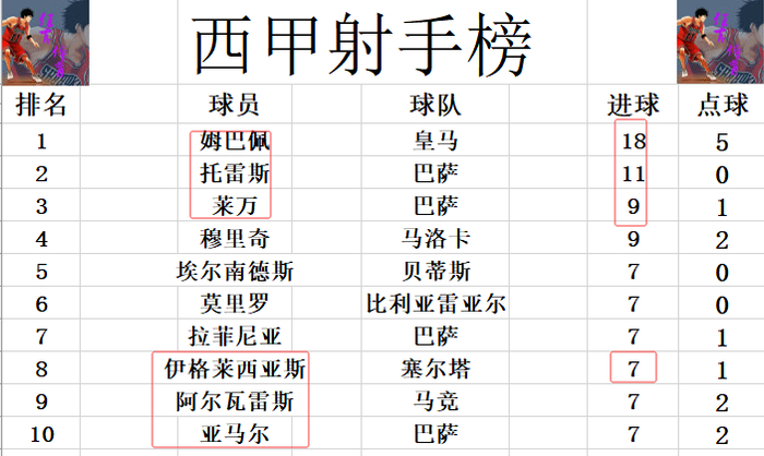 射手榜方面,姆巴佩18球高居榜首,托雷斯今天错失良机未能破门,还是11球排在第2。莱万最后打入一球,追上穆里奇,两人9球并列第3。莫里罗破门,伊格莱西亚斯双响,两人追上亚马尔,阿尔瓦雷斯等人,将前十门槛提高到7球。