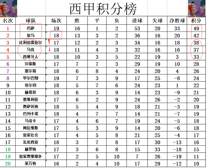 积分榜方面,巴萨先赛赢球后豪夺西甲9连胜,暂时将和皇马的差距拉大到7分,这半程冠军是相当的稳固。比利亚雷亚尔及时止住颓势,赢球后超过马竞1分重回前3。西班牙人无力在巴萨身上抢分,还是差马竞4分位列第5。