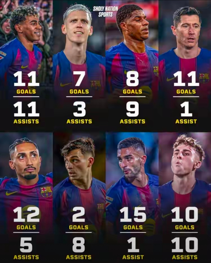 本赛季巴萨队内多达8人达成参与进球上双的成就,进攻火力分布极为均衡: