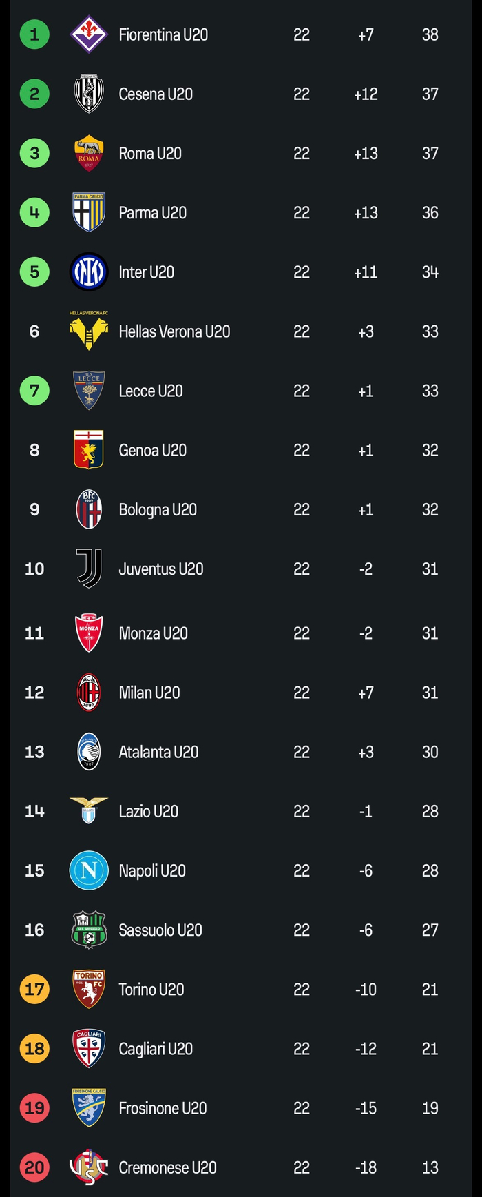 【预备队积分榜】2025-26赛季#意甲# 预备队联赛第22轮积分榜: