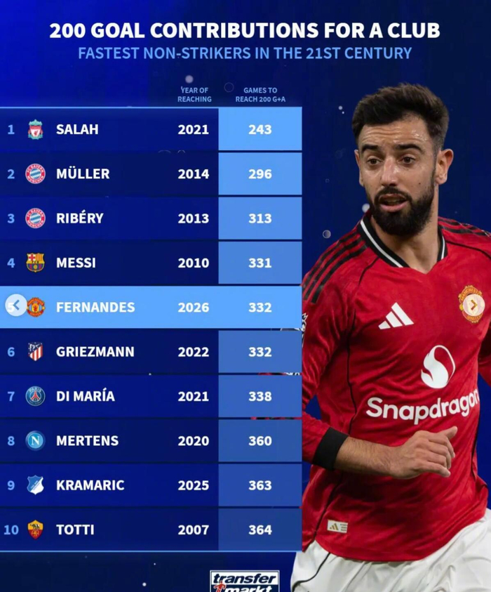 萨拉赫以243场居首,穆勒以296场排第二。本轮联赛达成这一成就的B费以332场排名第五。