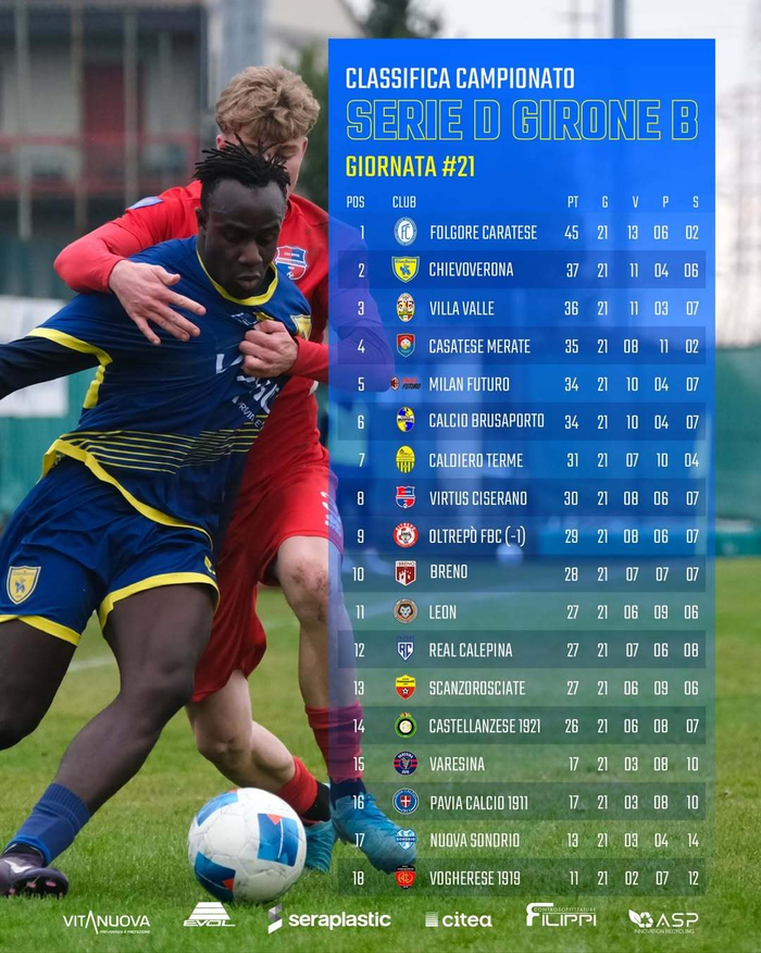 【意丁联赛B组积分榜】 #意丁联赛# 2025-26赛季意丁联赛第21轮积分榜: