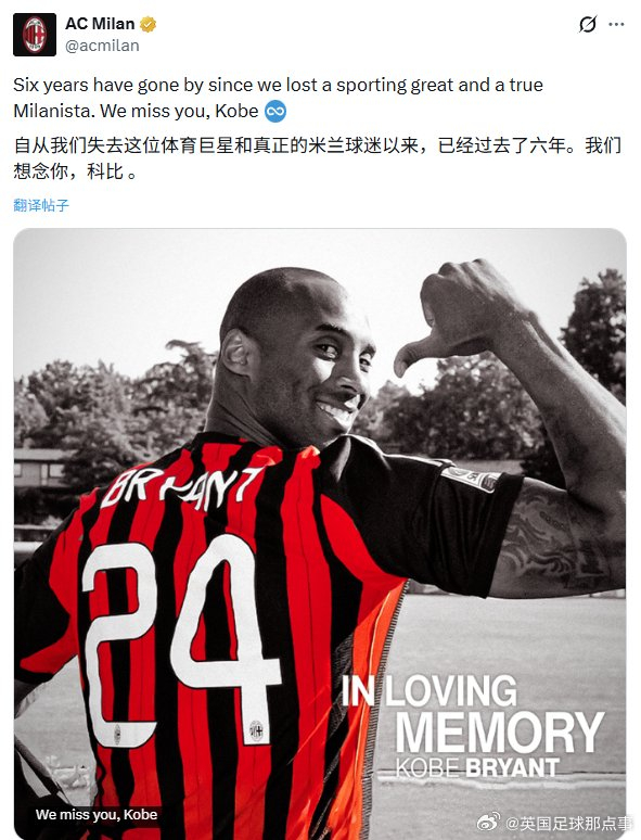 AC米兰官方昨天发文缅怀米兰球迷科比去世六周年