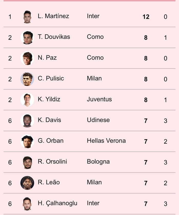 【意甲射手榜】 2025-26赛季#意甲联赛# 第22轮射手榜。👟#sempremilan#