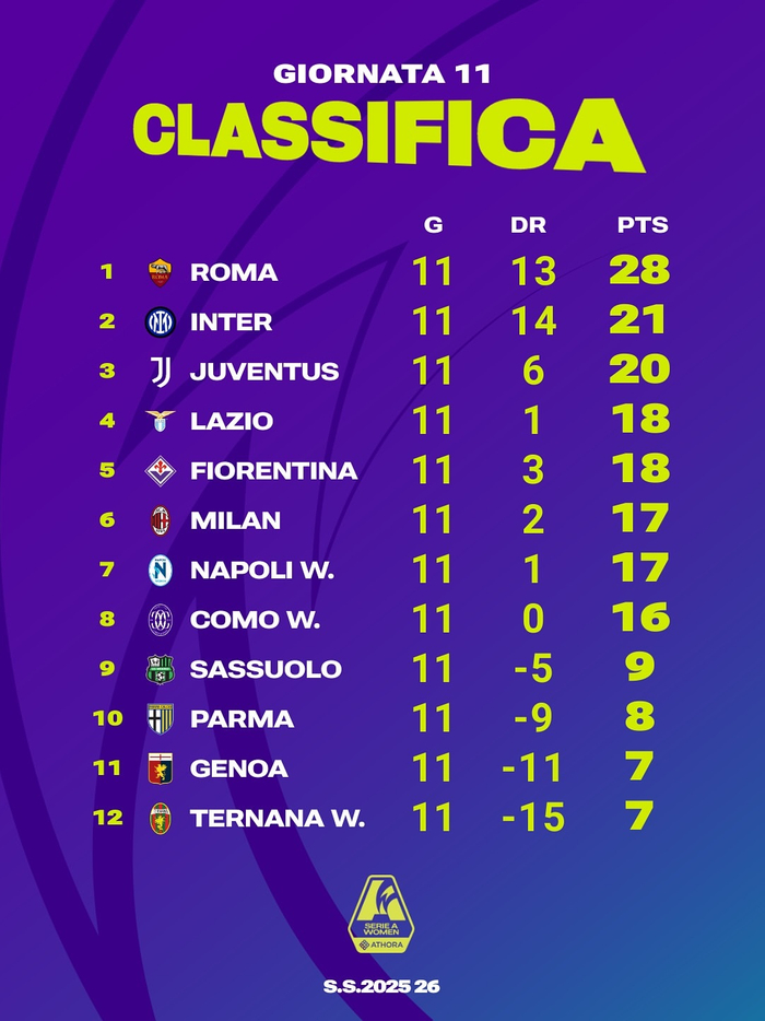 【女足积分榜】 2025-26赛季#意甲# 女足联赛第11轮积分榜。#sempremilan#