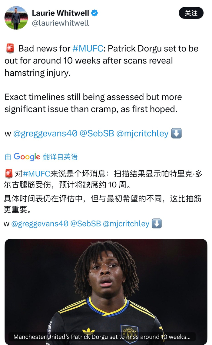 曼联后卫多尔古腿筋受伤预计缺阵10周