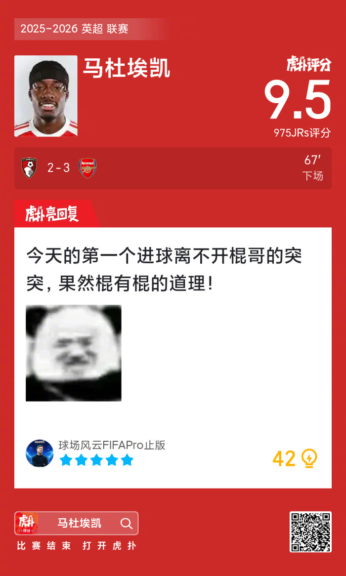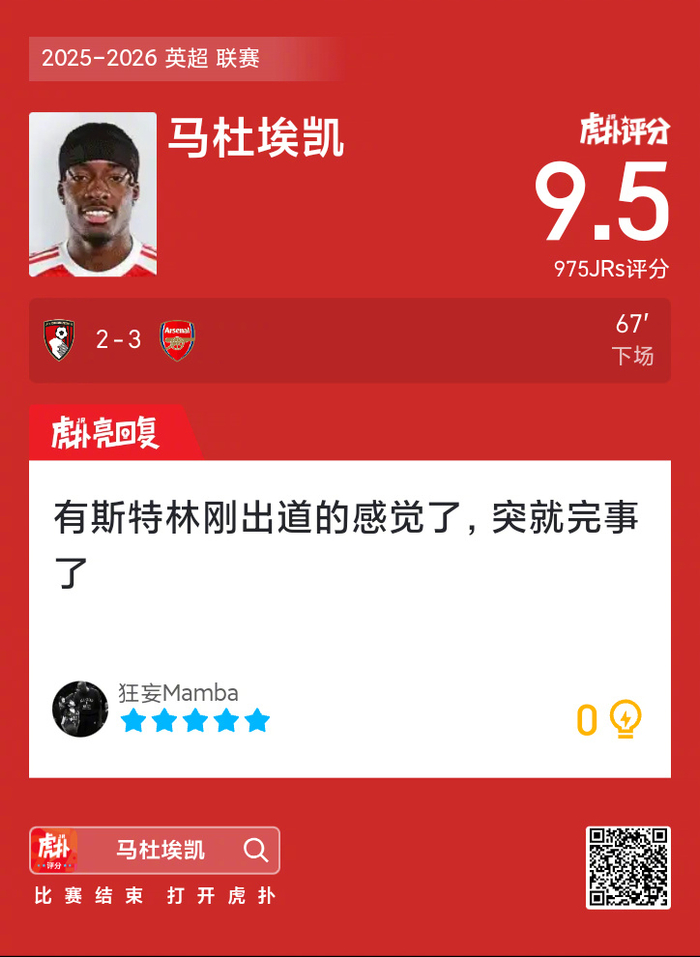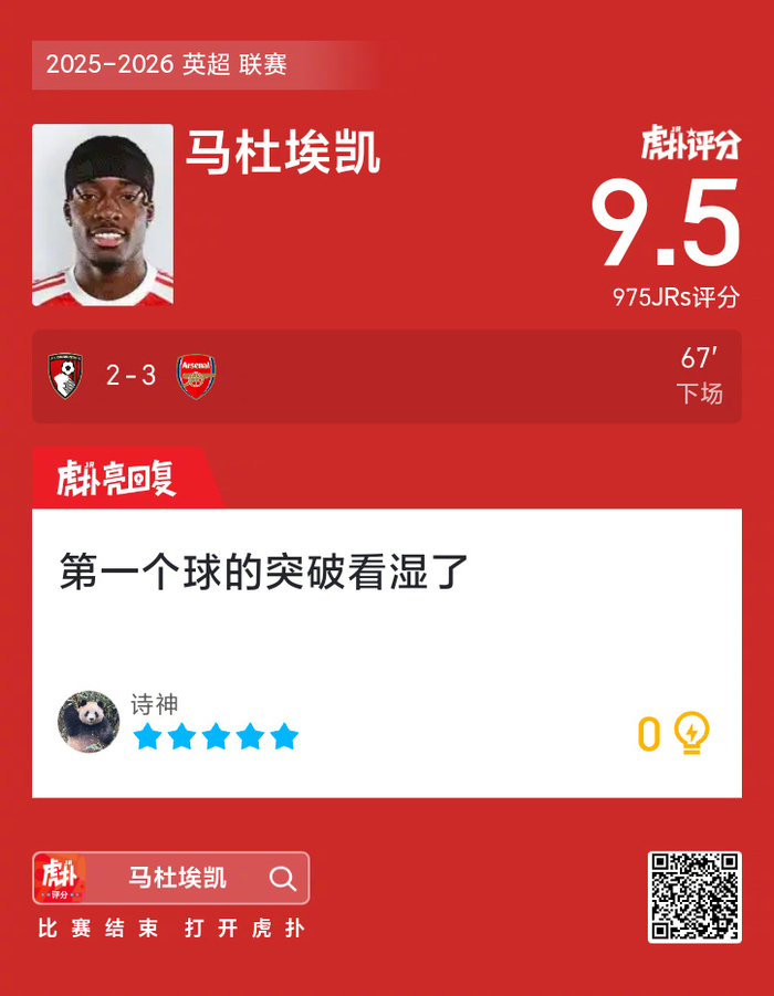 #伯恩茅斯2比3阿森纳# 马杜埃凯赛后收获9.5的虎扑评分!