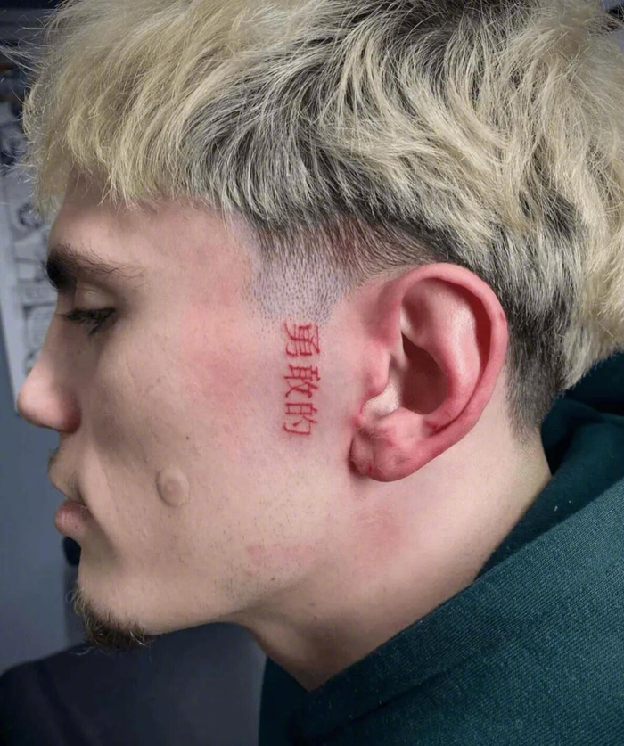 如图所示,加纳乔在鬓角位置纹上了三个汉字“勇敢的”