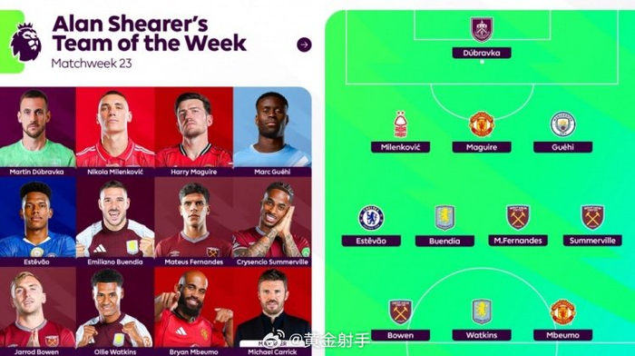 中场:埃斯特旺(切尔西)、布恩迪亚(阿斯顿维拉)、马特乌斯·费尔南德斯(西汉姆联)、萨默维尔(西汉姆联)
