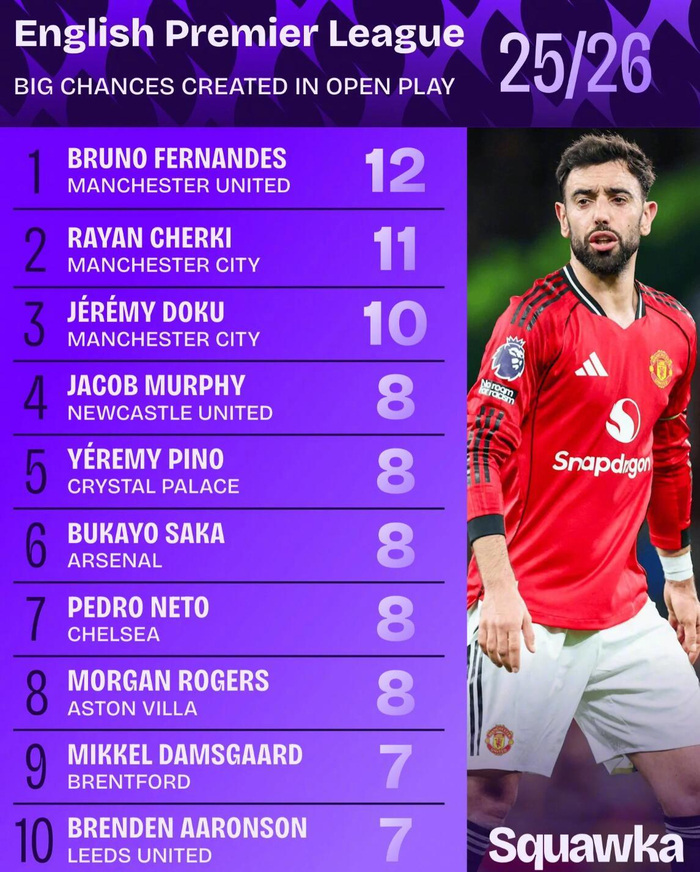 据著名统计机构Squawka的数据显示,曼联中场布鲁诺-费尔南德斯是本赛季英超运动战中创造重大机会最多的球员,曼城双星切尔基和多库紧随其后。