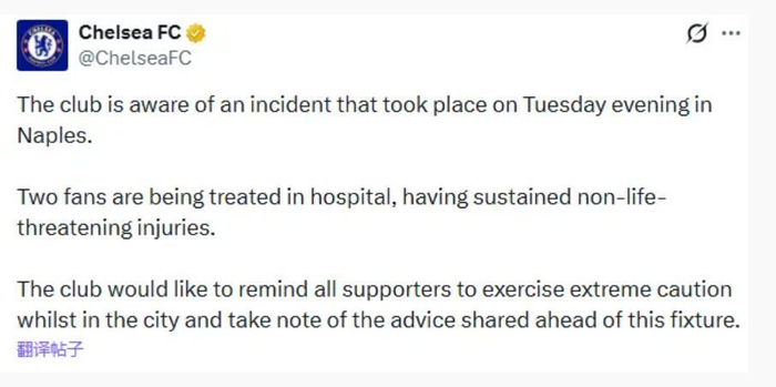 【25名那不勒斯极端球迷拿刀追击切尔西球迷,还直接捅伤2人】切尔西官方发布声明:俱乐部已获悉周二晚间在那不勒斯发生的一起事件,两名球迷正在医院接受治疗,伤势并无生命危险。俱乐部提醒所有球迷在城内务必格外小心,并注意赛前发布的人身安全注意的建议。