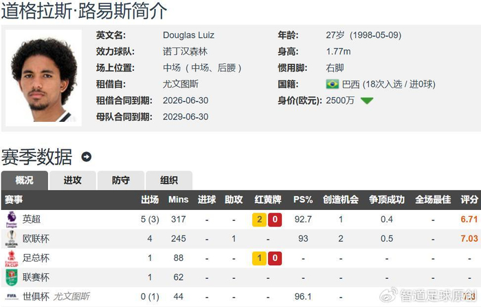 现年27岁的道格拉斯-路易斯,身高1.77米,右脚球员,主打中场位置,也可以踢后腰,德转估价2500万欧元,与阿斯顿维拉的买断费用一致。道格拉斯-路易斯本赛季英超出场仅有8次,其中5次首发,合计出场317分钟,没有参与进球;欧联杯首发出场4次,有1次助攻,足总杯和联赛杯各首发出场1次。
