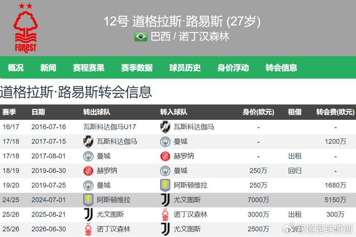 道格拉斯-路易斯于2017年夏窗以1200万欧元的转会费从瓦斯科达伽马加盟曼城,立马被外租至赫罗纳效力2年,2019年夏窗以1680万欧元的转会费加盟阿斯顿维拉,在埃梅里战术下成为球队核心球员。道格拉斯-路易斯于2024年夏窗以5150万欧元的转会费离开阿斯顿维拉加盟尤文图斯,但发展未达预期,球员选择2025年夏窗以300万欧元的转会费回归英超加盟诺丁汉森林,如今要提前结束租借回归阿斯顿维拉。