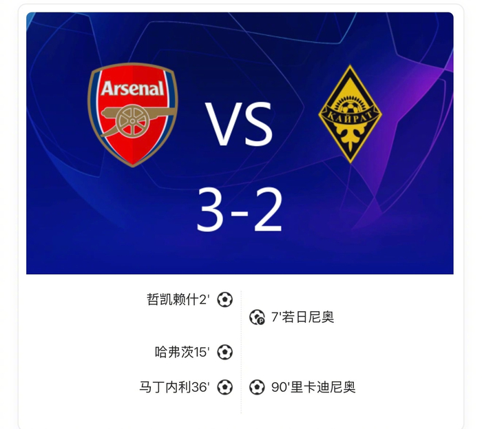 欧冠:阿森纳3-2凯拉特,哈弗茨传射,哲凯赖什破门!