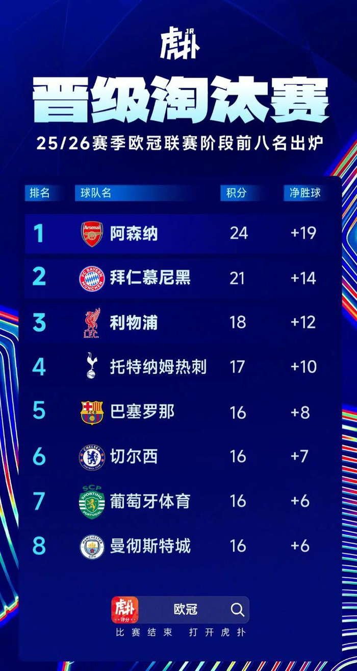 欧冠联赛阶段的比赛已经全部结束,积分榜前八名也正式出炉。