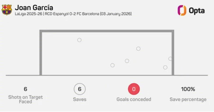 #西班牙人0比2巴萨# 据统计,乔安-加西亚成为自2023年11月对阵皇家社会的特尔施特根以来,首位在西甲单场完成6次扑救且未失球的巴塞罗那门将(同样是6次)。