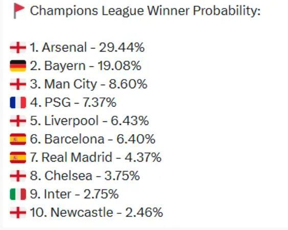最新的欧冠概率榜上,阿森纳高居第一,拜仁慕尼黑紧随其后,曼城、巴黎圣日耳曼、利物浦排在前5位,巴塞罗那、皇家马德里、切尔西、国际米兰、纽卡斯尔排在第6至第10位。