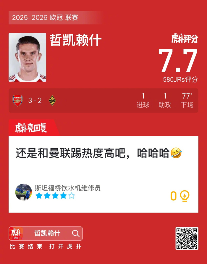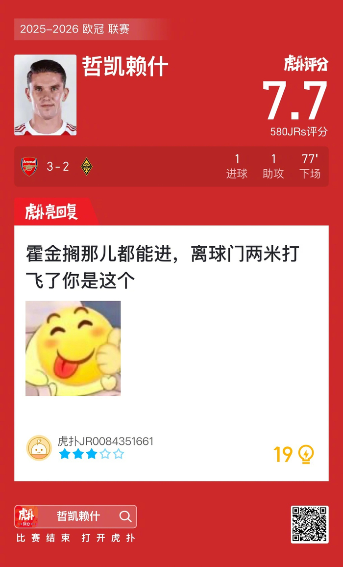 #阿森纳3比2阿拉木图凯拉特#哲凯赖什打进一球贡献一次助攻,收获7.7的虎扑评分!